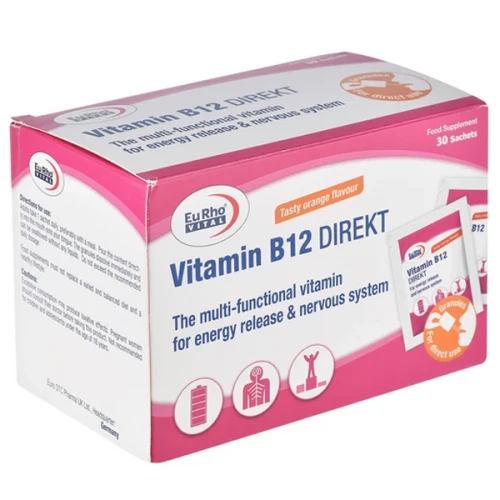 ساشه ویتامین B12 دایرکت یوروویتال بسته ۳۰ عددی یک مکمل غذایی ویتامین B12 در قالب ساشههای قابلحل است که بدون نیاز به آب مصرف میشوند. این محصول با تأکید بر افزایش انرژی، کاهش خستگی و حمایت از سیستم عصبی و ایمنی بدن و کمک به ساخت گلبولهای قرمز خون طراحی شده است.