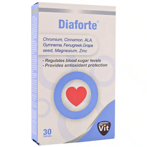 قرص دیافورت استارویت 30 عدد یک مکمل تخصصی برای کمک به تنظیم قند خون و کنترل شاخص گلیسمی در افراد مبتلا به دیابت و پیشدیابت است. ترکیب هدفمند عصارههای گیاهی بههمراه مواد معدنی و آلفا لیپوئیک اسید، علاوه بر کمک به متابولیسم قند، در کاهش استرس اکسیداتیو و تقویت سلامت عمومی و سیستم ایمنی نیز مؤثر است.